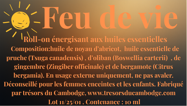 Inspiré des Hong Thai, rituels aromatiques traditionnels largement utilisés au Cambodge et en Thaïlande pour stimuler l’énergie vitale et réveiller les sens, le roll-on Feu de Vie est conçu comme un geste simple et puissant pour accompagner les moments de fatigue, de dispersion ou de manque d’élan.